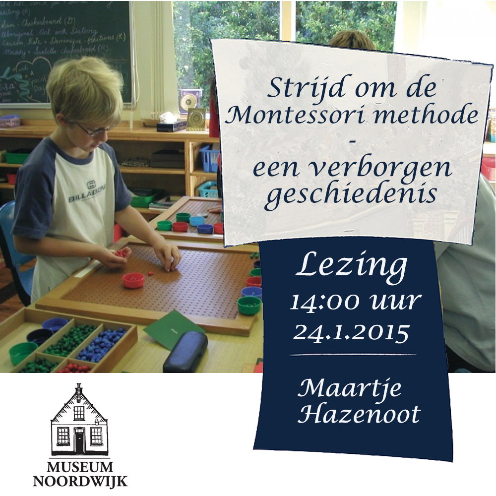 De tentoonstelling ‘Maria Montessori, door het kind naar een nieuwe wereld’ is aanleiding geworden voor het organiseren van een lezing op zaterdag 24 januari 2015 om 14:00 uur in Museum Noordwijk met de titel ‘Strijd om de Montessori methode: een verborgen geschiedenis’ door Maartje Hazenoot.